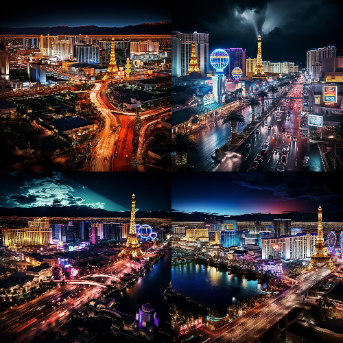 미드저니로 라스베이거스의 많은 불빛들이 있는 야간 사진을 고각도로 찍어주고, 실제 사진처럼 보이게 만들어줘! 그리고 가로:세로 비율은 16:9로 만들어줘라고 명령어를 줬습니다.