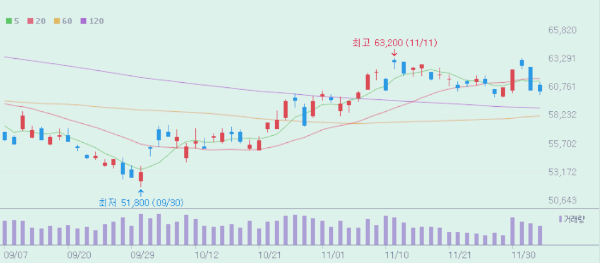 삼성전자의 주가위치다. 내 견해는 당분간 63,200원을 찍을 가능성이 낮아보인다.