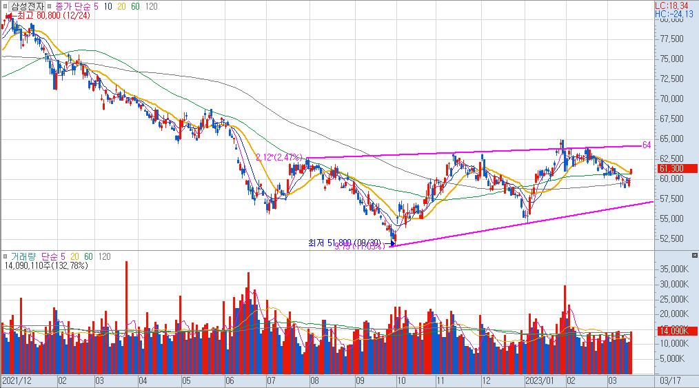 먼저, 삼성전자의 일봉을 먼저 보겠습니다. 상단과 하단을 만들어 두고 추세를 보게 되면, 하단은 점점 높여가고 작업이 있는 것을 볼 수 있습니다.