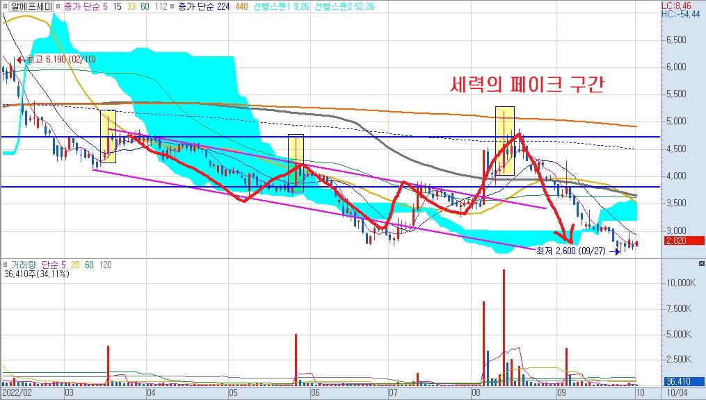 2022년 상반기에는 하락 추세를 이어가다가 448일선의 매물대를 한 번 터치하고는 내려왔습니다. 아래 거래량을 보게 되면 일정한 간격으로 큰 거래량이 들어온 모습이 보입니다. 세력에 의한 거래량으로 아마도 천천히 하락시키면서 매집을 한 것으로 보입니다.