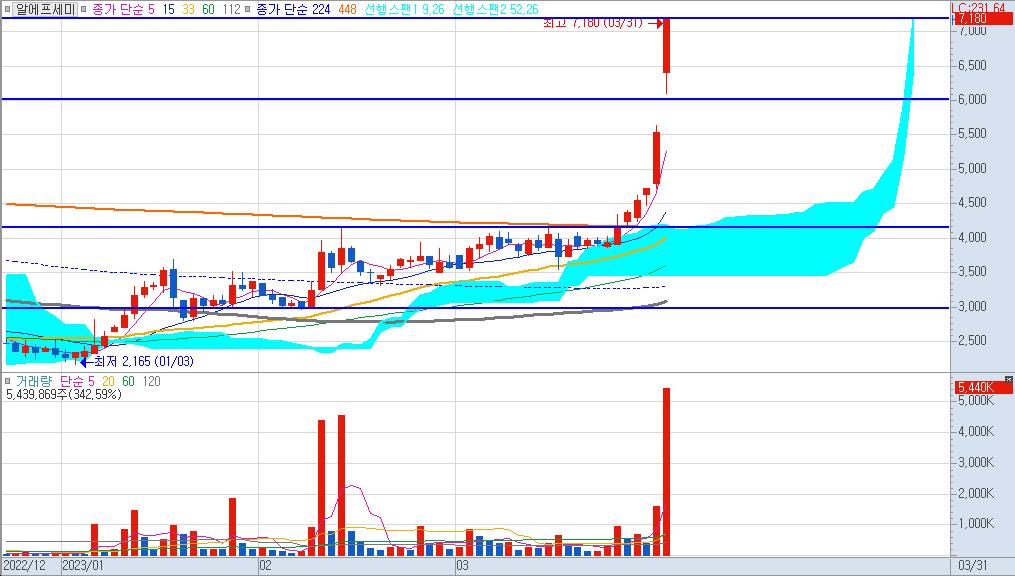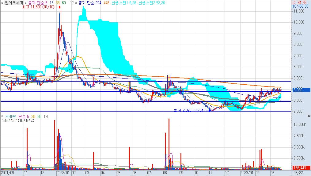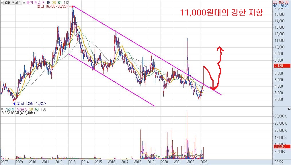 현재 구간이 물량을 터트리는 구간은 아닌 것으로 보입니다. 448일선을 올라타고 급등이 나오고 있는 알에프세미의 현재 주가 모습입니다. 하지만 세력이 물량을 터는 모습으로 보기에는 거래량이 부족해 보입니다.
