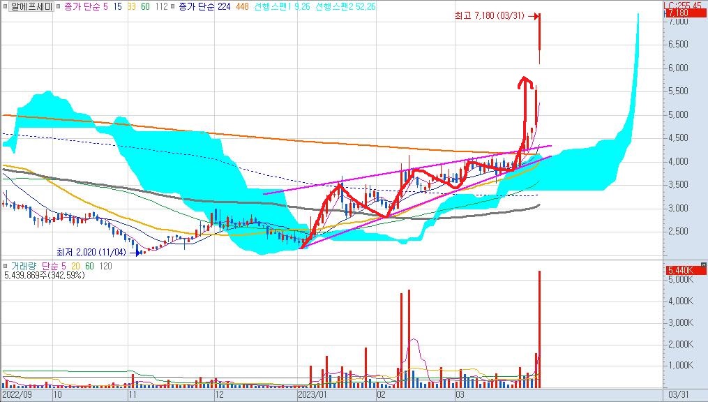 알에프세미의 최근 주가 모습을 보면 상승하면서 주가가 한 곳으로 수렴하는 형태인 상승쐐기형의 패턴이 나옵니다. 그러고 나서 추세 상단을 넘어서면서 급등이 나온 모습입니다. 확실하게 448일선은 강한 지지선이기도 하지만 강한 저항선이기 때문에 저항선을 주가가 뚫게 되면 응축된 에너지가 나오기 마련입니다.
