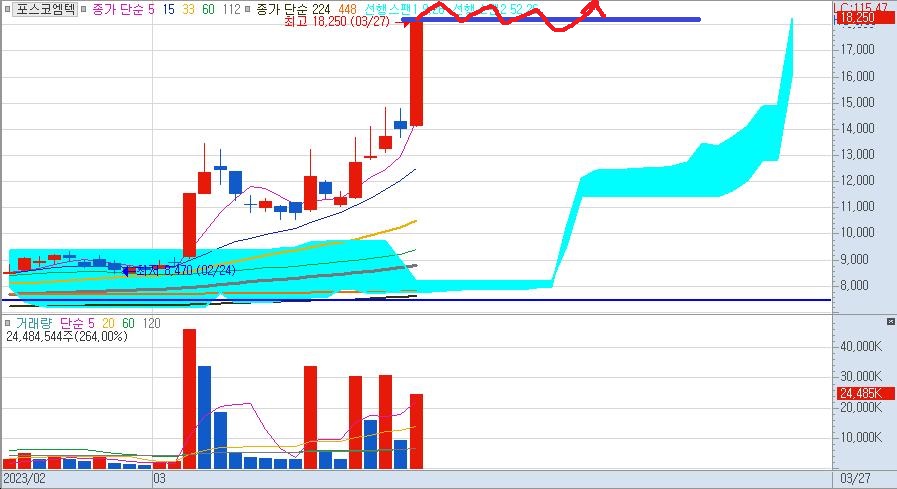 신고가를 달성한 종목은 위에 매물이 없기 때문에 눌림목이 짧고 더 쉽게 올라갈 수 있다는 장점이 있습니다. 그리고 고점을 갱신하면서 거래량을 터트린 흔적이 없기 때문에 세력이 빠져나갔다고 보기에도 어렵습니다. 그리고 짧은 눌림목 구간 형성 후 마지막 파동을 만들어 갈 것 같습니다. 눌림목의 가격대가 어느 정도일지는 예측하기 힘들지만 아마도 18,250원 부근에서 이루어지면 좋겠습니다.