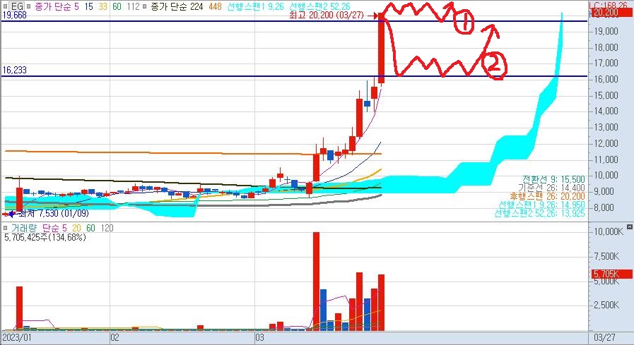 EG는 52주 신고가를 만들어냈습니다. 포스코엠텍과 마찬가지고 리튬 관련주로 상하로 변동성이 높은 종목으로 보입니다. 그동안 소화하지 못했던 고점의 매물을 전부 소화하고 상한가를 만들어 냈습니다. 아래의 차트로 보면 매우 고점으로 보이는 종목입니다.