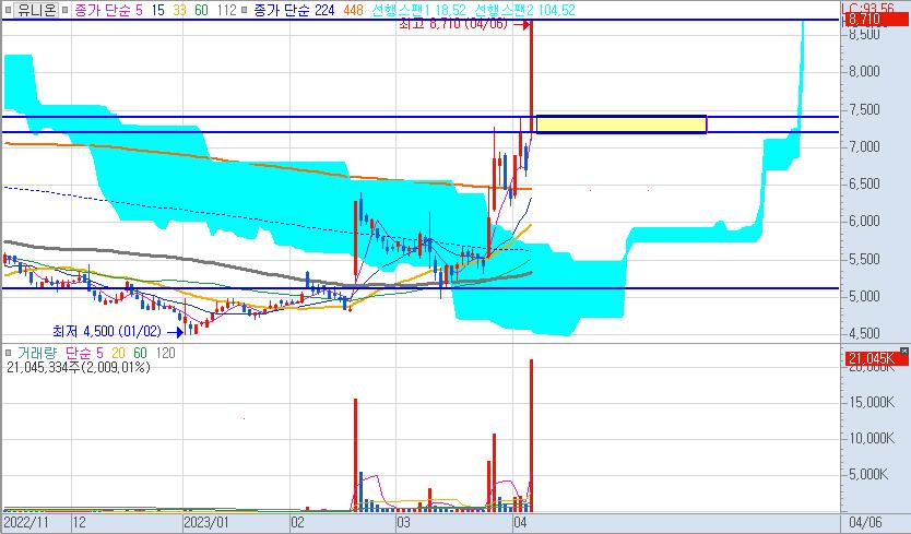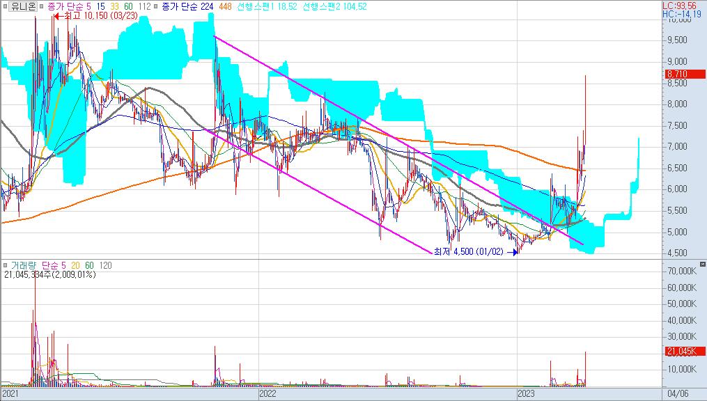 유니온은 2021년 말부터 2022년 말까지 하락추세 속에 있었던 종목입니다. 그리고 최근에서야 112일선을 뚤어내면서 224일선까지 상승을 했고 눌림목 구간을 거친뒤 다시 448일선까지 상승하는 모습을 보여주고 잇습니다.