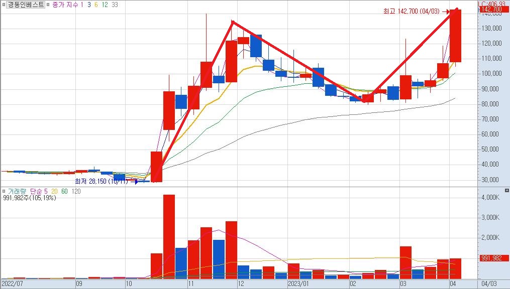 경동인베스트의 경우 시가 총액이 3,000억원에 달하는 점과 본 회사와 연관 있는 이슈가 아닌 자회사의 이슈로 상승하기 때문에 매출과 사업 성장에 대해서는 나아지겠지만 주가가 더 상승하기 위해서는 재료가 부족해보입니다. 다만 작년 10월부터 이어진 장기간의 조정과 매물대를 뚫어내는 모습이 현재 주가가 지속적인 상승을 할 수 있는 재료가 될 것같습니다. .