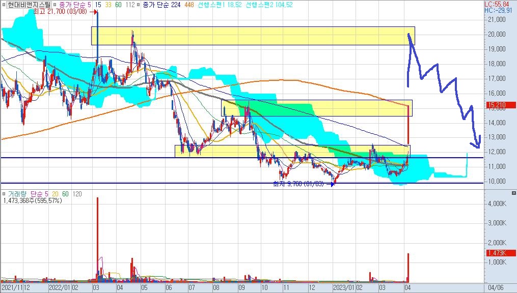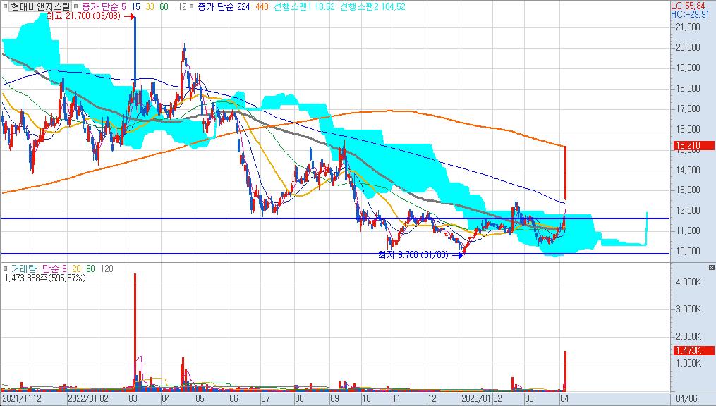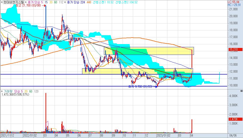현대비앤지스틸의 현재 주가는 이제 막 구름대를 벗어나고 448일선을 터치한 모습입니다. 10,000원 ~12,000원대에서 만들었던 박스권을 탈출하면서 갭으로 224일선을 넘어서 448일선까지 한번에 도달하는 힘을 보여줬습니다.