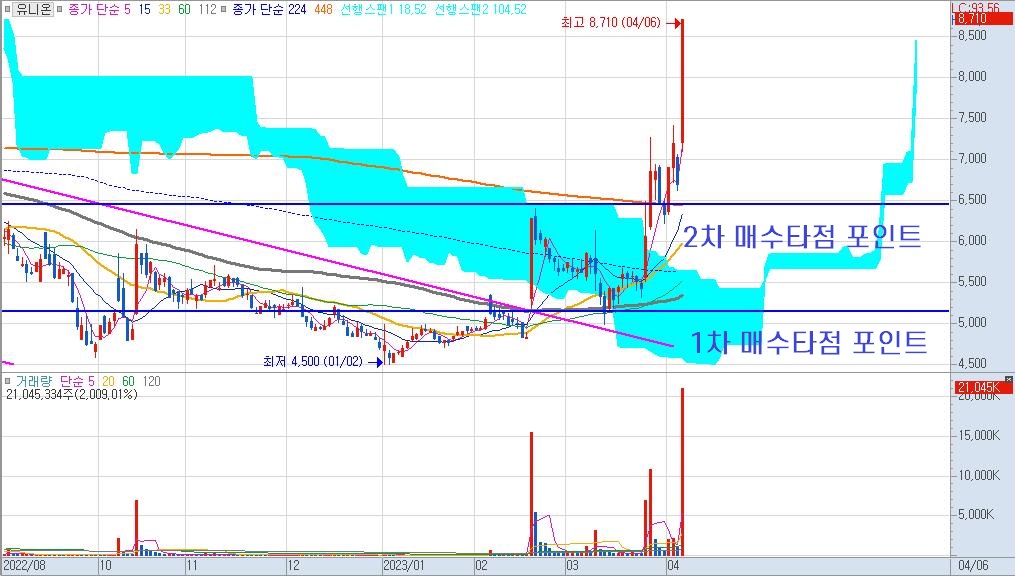 유니온에 대한 첫 번째 매수 포인트는 단기 스윙관점에서 112일선을 터치할 때 였습니다. 또한 2차 매수 포인트는 구름대를 뚤고 올라서서 448일선 근처에서 단기 조정이 나올때 이었습니다.