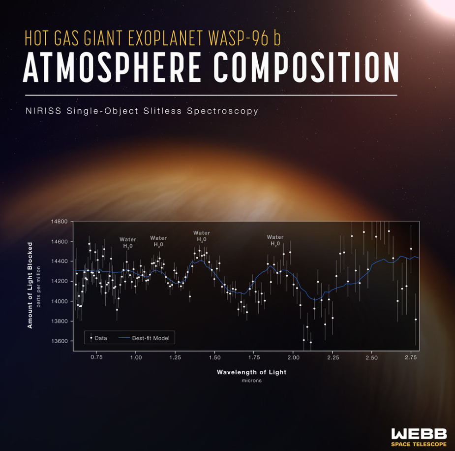2022년 7월에 올라온 제임스 웹의 분석 자료를 보면 외계행성인 WASP-96b 행성에 구름이 있음을 예보했습니다. 이는 외계행성에도 물이 있다는 증거를 찾은 자료이며, 행성의 대기를 통해 걸러진 빛을 분광기로 분석하여 밝혀낸 것입니다.