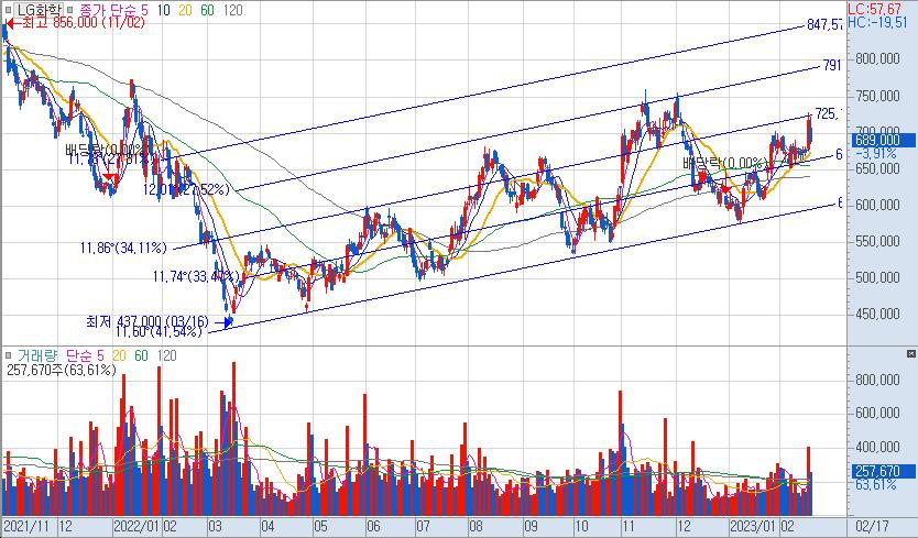 LG화학의 주봉은 점점 발산해 나가고 있는 형태입니다. 언젠가는 저 발산 추세를 뚫고 위로 솟구치는 차트를 볼 수 있게 되면 좋겠습니다.