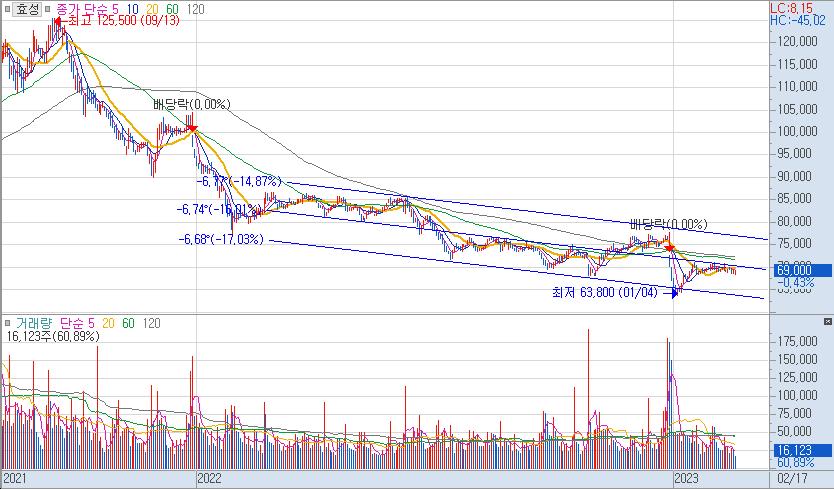 효성도 아직은 하락추세에서 벗어나지 못한 모습입니다. 중간선에서 한 번은 지지했지만, 지지대가 깨지면서 하단선까지 내려가는 모습을 보여줬습니다. 또한 아직 중간 저항선을 뚫어내지 못했습니다. 하단선 부근에서는 확실하게 지지하는 모습이 나오긴 했지만 추세선의 방향이 바뀌는 모습을 보여줄 필요가 있겠습니다.