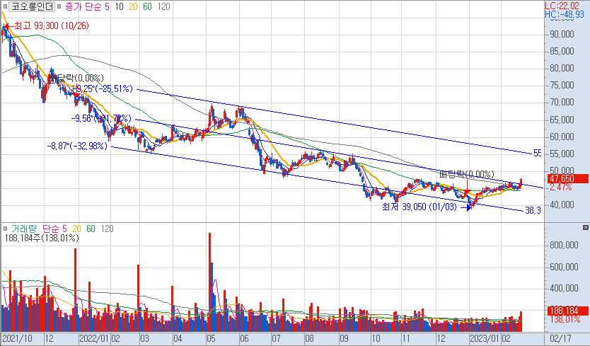 코오롱인더도 역시 하락추세가 이어지고 있습니다. 올라온 폭만큼 가격조정이 이어져야 또 올라갈 수 있겠죠? 그런 면에서 보면 아직까지 시간이 필요해 보입니다.