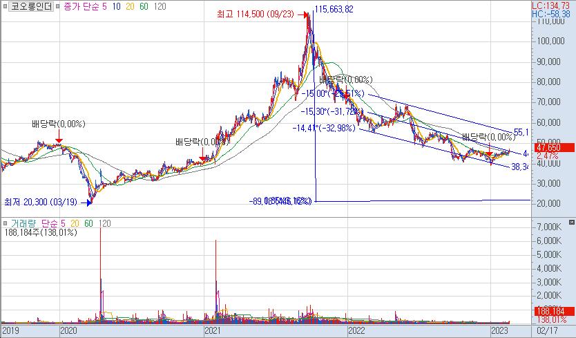 전체 추세는 2020년 큰 파동을 만든 후 하락 추세가 이어지고 있는 상태입니다. 크게 올라온 만큼 장기간 하락 추세를 이어갈 확률이 커 보이는 차트입니다. 또 낮은 가격에서 주식을 모아갈 수 있는 기회이기도 합니다. 하락추세를 돌려나가는 모양부터 나와야 하겠지만 현재 가격이 고점 대비 73%가 빠져있는 지점이기 때문에 이 지점부터는 걱정할 필요 없이 모아가도 될만한 가격입니다. (주식 매수에 대한 추천은 아닙니다.)