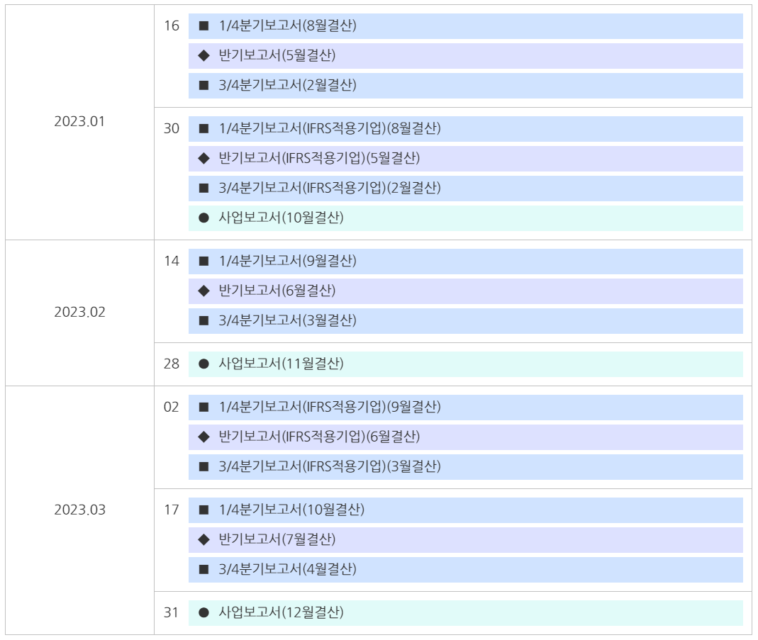 또한 기업은 불성실 공실 벌점을 면하기 위해서는 정확한 공시일정을 지켜야 합니다. 다음은 1분기에 진행해야할 공시업무 일정에 대한 내용입니다.