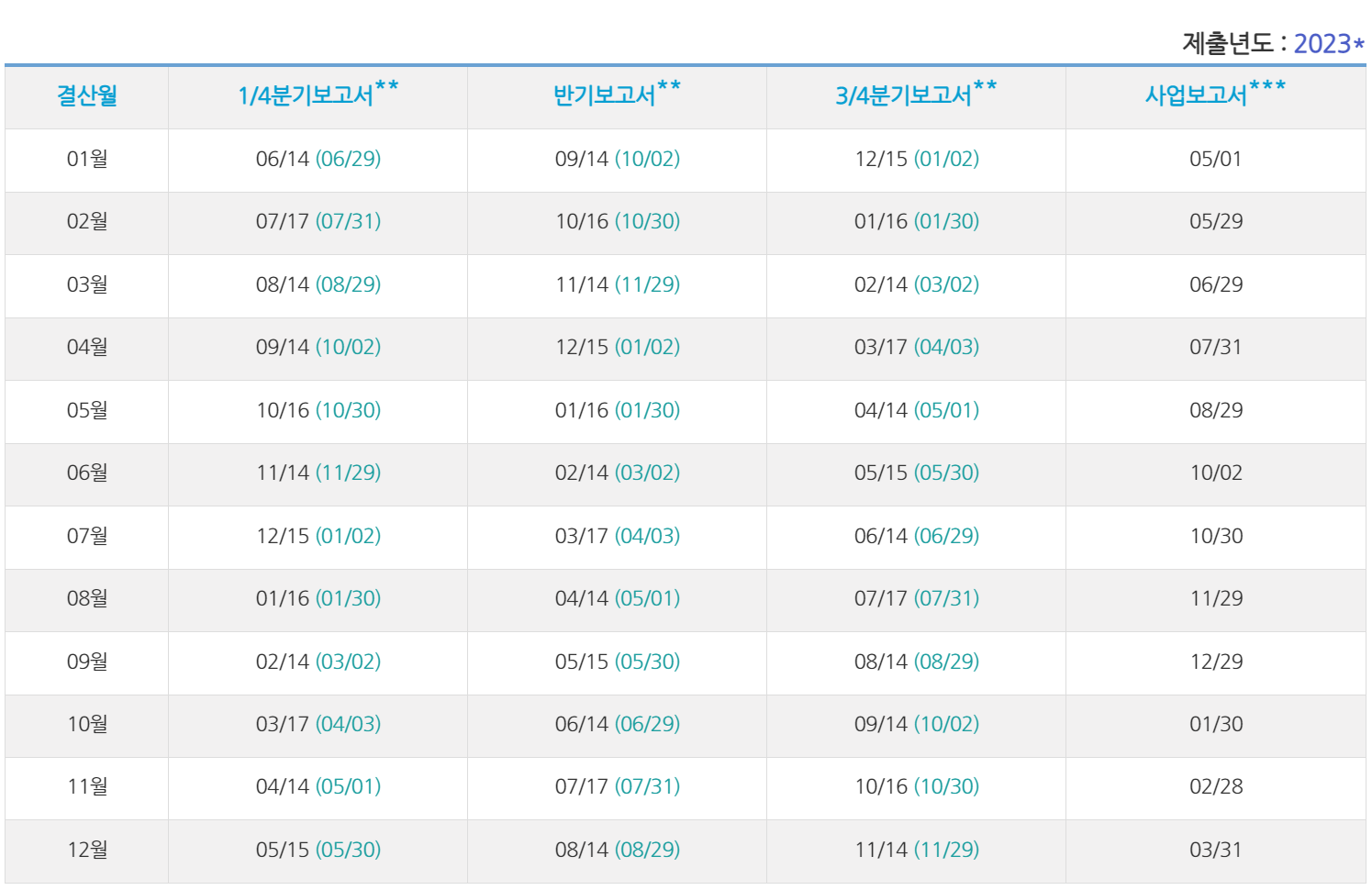 다음은 결산원별 제출해야 하는 정기보고서의 일정 기한입니다.