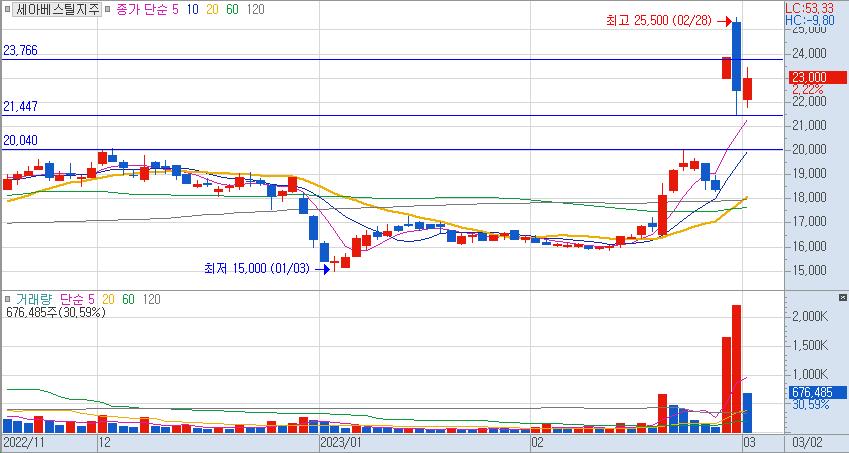 세아베스틸지주는 다양한 기술을 바탕으로 탄탄한 수익을 자랑하는 기업입니다. 주가에서도 보면 알 수 있겠지만 거래량이 터지면서 갭상승을 한 뒤 큰 음봉을 하나 만들어냈습니다. 주가위치는 바로 하락으로 전환할 것 같지 않습니다. 다만 큰 음봉의 밑꼬리의 가격선을 지켜준다면 기간조정을 거친 후, 다시 한번 상승을 보여줄 가능성이 있습니다. 일봉상으로는 골든크로스를 만들어내는 과정이기도 하고, 주가를 만들어내는 모양이 20일선을 지지받아 한번에 뛰어올라왔기 때문에 숨고르기는 필요해 보입니다.