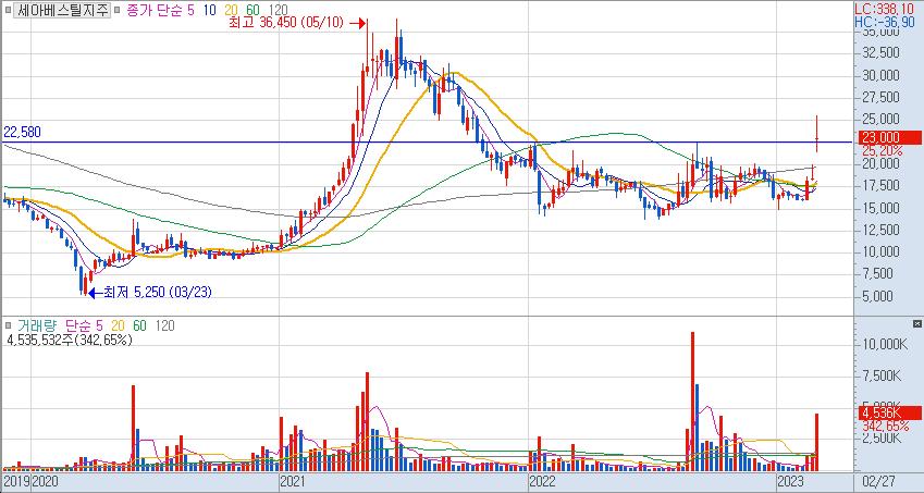 세아베스틸지주는 다양한 기술을 바탕으로 탄탄한 수익을 자랑하는 기업입니다. 주가에서도 보면 알 수 있겠지만 거래량이 터지면서 갭상승을 한 뒤 큰 음봉을 하나 만들어냈습니다. 주가위치는 바로 하락으로 전환할 것 같지 않습니다. 다만 큰 음봉의 밑꼬리의 가격선을 지켜준다면 기간조정을 거친 후, 다시 한번 상승을 보여줄 가능성이 있습니다. 일봉상으로는 골든크로스를 만들어내는 과정이기도 하고, 주가를 만들어내는 모양이 20일선을 지지받아 한번에 뛰어올라왔기 때문에 숨고르기는 필요해 보입니다.