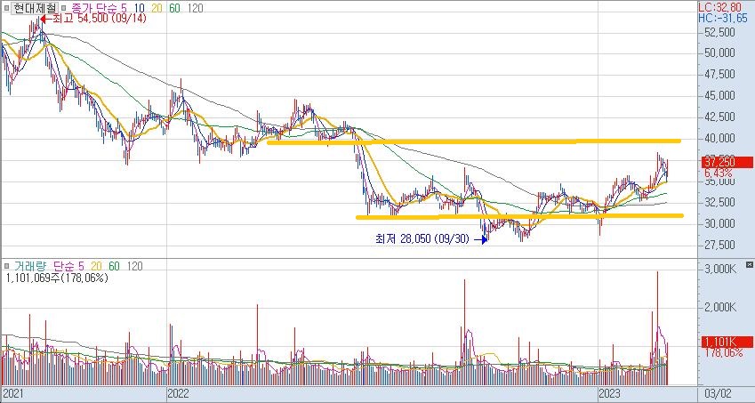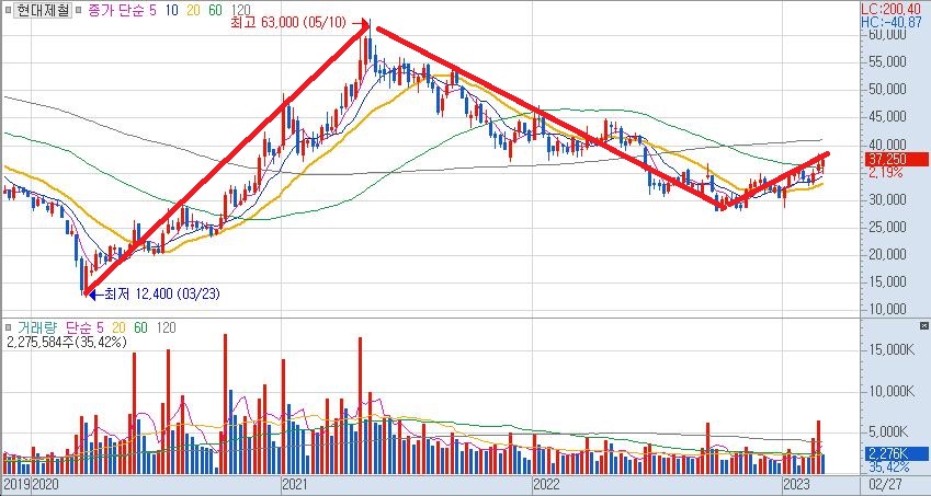2022년 현대제철도 다른 종목과 마찬가지로 기나긴 하락에 들어갔습니다. 그러다가 2022년 말에 20주선을 돌파한 후 지지를 받고 60주선 위에 안착하려는 모습을 보이고 있습니다. 역시 대기업답게 선방하는 모습을 보여줍니다.