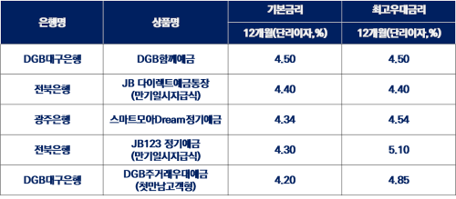 있는 것과 같이 DGB 대구은행, 전북은행, 광주은행에서 판매되고 있는 5개의 상품이 기본금리가 높은 것을 알 수 있습니다. 이외에는 BNK부산은행에서 판매되고 있는 상품까지 총 6개의 상품에 대해 알아보도록 하겠습니다.