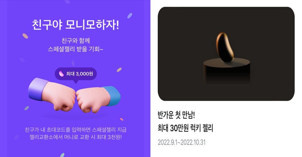 그리고 처음 오시면 럭키젤리를 주는 이벤트가 있으니 꼭 이벤트 젤리는 챙겨가시길 바랍니다. 이 럭키젤리가 상당히 많이 주는 것 같아요. 럭키젤리를 잘만 이용하신다면 첫 달에 최대 30만원까지는 받아가실 수 있다고 합니다. 근데 한 가지 아쉬운 점이 이벤트는 기한이 정해져 있기 때문에 2022년 10월 31일까지만 받으실 수 있나 봐요.