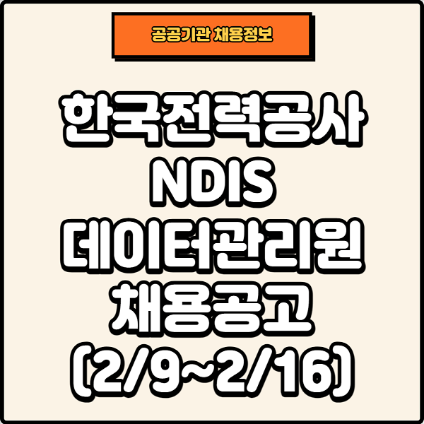 한국전력공사 소속으로 NDIS데이터관리원 채용이 시작됩니다. 접수기간은 2023년 2월 9일부터 2월 16일 11시까지이며, 채용 규모는 정규직 3명입니다.