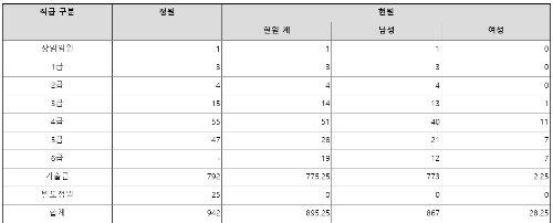 전체 정원이 942명에 기술급 정원이 792명입니다. 기관의 대부분이 기술급 인력이라고 볼 수 있습니다. 현원 또한 775명으로 가장 많습니다. 사무인력은 119명입니다.