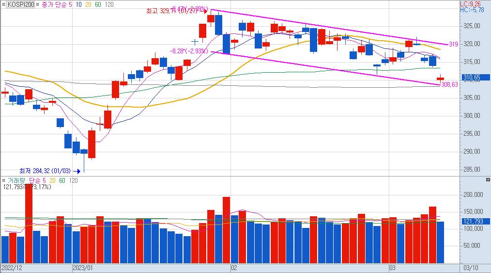 일봉으로 보면 지수 하락하는 형태가 점점 내려오는 것이 아닌 갭으로 뚫고 내려가는 형태를 그리고 있습니다. 그것도 중요한 이평선인 20일선 밑으로 내려와 버렸습니다. 코스피 200도 마찬가지이긴 하지만 조금 더 잔인하게 내려왔습니다. 이것은 대형주 위주로 먼저 하락이 나왔다는 뜻이기도 합니다. 코스피와 코스피 200의 차이를 보면, 코스피는 밴딩 바깥에 마지막 봉이 걸쳐있는 모습이지만, 코스피 200은 밴딩 하단에서 지지받는 모습을 취하고 있습니다.