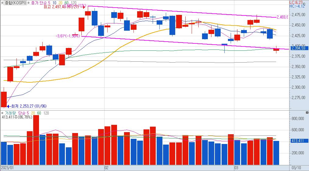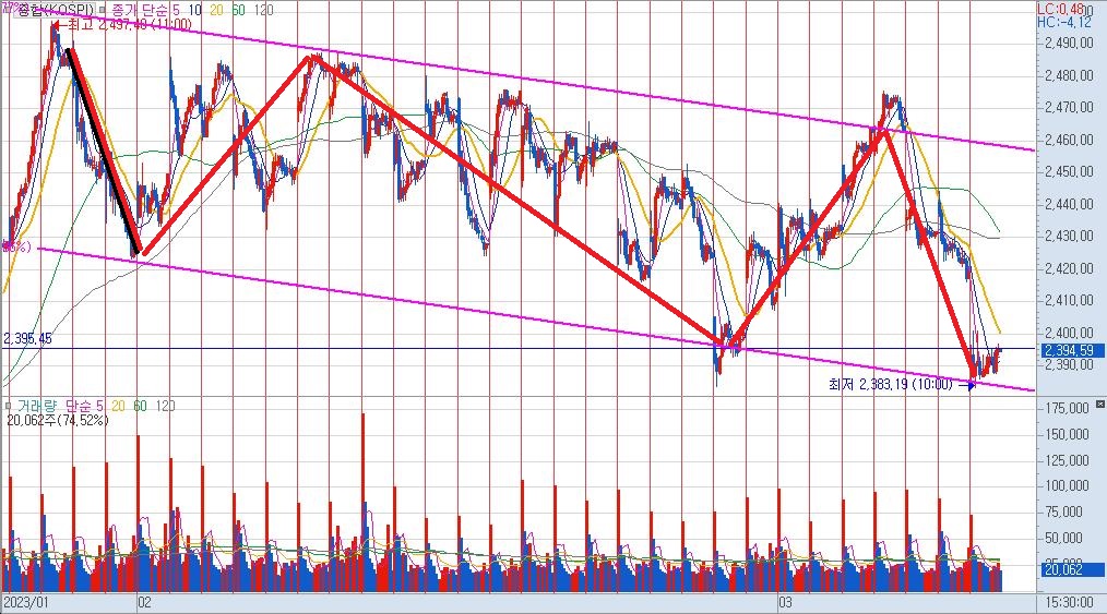 최근 주가의 움직임을 먼저 보겠습니다. 30분 봉을 보게 되면 수렴 과정이 아닌, 밴딩에서 주가가 움직여주는 모습입니다. 현재 그림은 30분 봉입니다. 마지막 상하 움직임은 6일에 걸쳐 올려놓은 주가를 단 3일 만에 전부 되돌려놓은 모습니다. 2월 동안 비슷한 자리에서 머물면서 지지부진했던 주가 움직임에 비하면 확연히 달라진 모습입니다. 6일의 상승동안 소위 대한민국 코스피 전체 시총의 상위를 차지하는 기업의 주가는 지지부진했고, 중소형주 위주의 움직임을 보였습니다. 가장 불안할 때의 지수 움직임이기도 합니다. 대형주와 중소형주가 번갈아 가면서 순환매가 들어오는 형태가 아닌, 대형주는 지수를 떠받치는 용도로 사용하고 실제 움직이는 종목은 개인이 접근하기 힘든 종목들이었습니다.