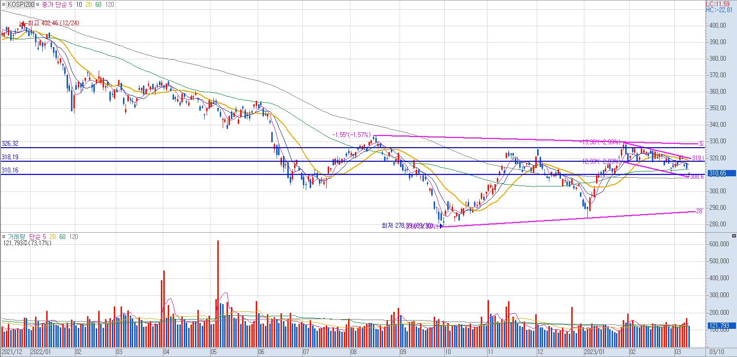일봉으로 보면 지수 하락하는 형태가 점점 내려오는 것이 아닌 갭으로 뚫고 내려가는 형태를 그리고 있습니다. 그것도 중요한 이평선인 20일선 밑으로 내려와 버렸습니다. 코스피 200도 마찬가지이긴 하지만 조금 더 잔인하게 내려왔습니다. 이것은 대형주 위주로 먼저 하락이 나왔다는 뜻이기도 합니다. 코스피와 코스피 200의 차이를 보면, 코스피는 밴딩 바깥에 마지막 봉이 걸쳐있는 모습이지만, 코스피 200은 밴딩 하단에서 지지받는 모습을 취하고 있습니다.