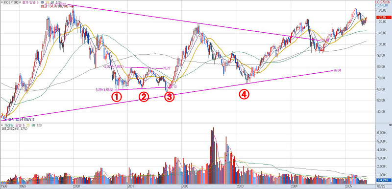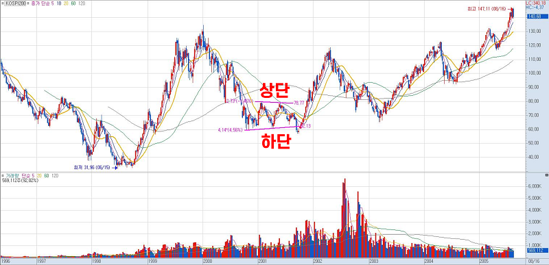 첫번째 과거 사례 자료는 2000년부터 2001년, 2년 동안 지수가 수렴과정을 거치면서 힘을 모았던 사례입니다. 아래 있는 코스피 200 지수는 주봉입니다. 짧아 보이지만 거의 1년 동안 지수가 밴딩 안에서 머물렀습니다. 항상 모든 운동에너지는 힘을 발산한 이후 다시 힘을 쓰기 위해서는 힘을 모아가는 과정이 필요합니다. 이 당시에도 지수로 대형 상승이 나왔고, 지금처럼 큰 하락장이 있었으며 1년간 바닥을 만드는 과정이 있었습니다. 밴딩의 상단과 하단을 그림처럼 표시했습니다.