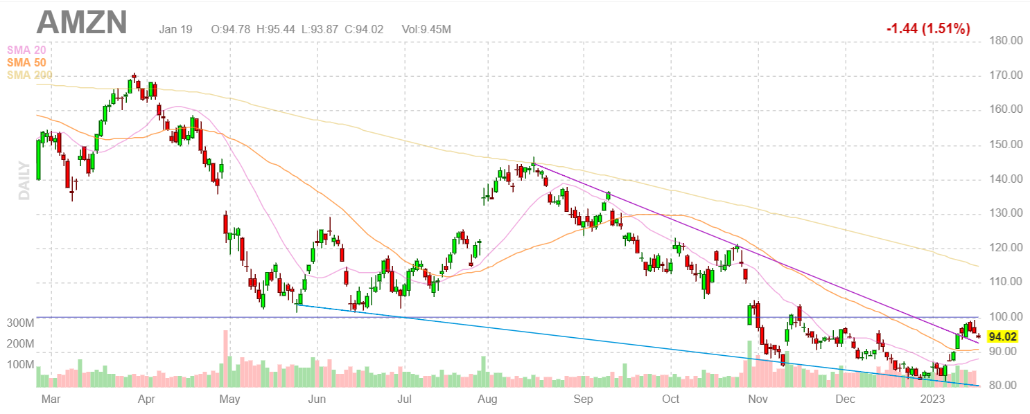 아마존(AMZN)은 하락 추세 밴드 상단을 넘어갔습니다. 만약 아마존에 투자하고 싶으시다면 90달러대에 있는 하락 추세 밴드 상단에서 지지 받는 모양을 보고 판단해 보시는 것이 좋겠습니다.