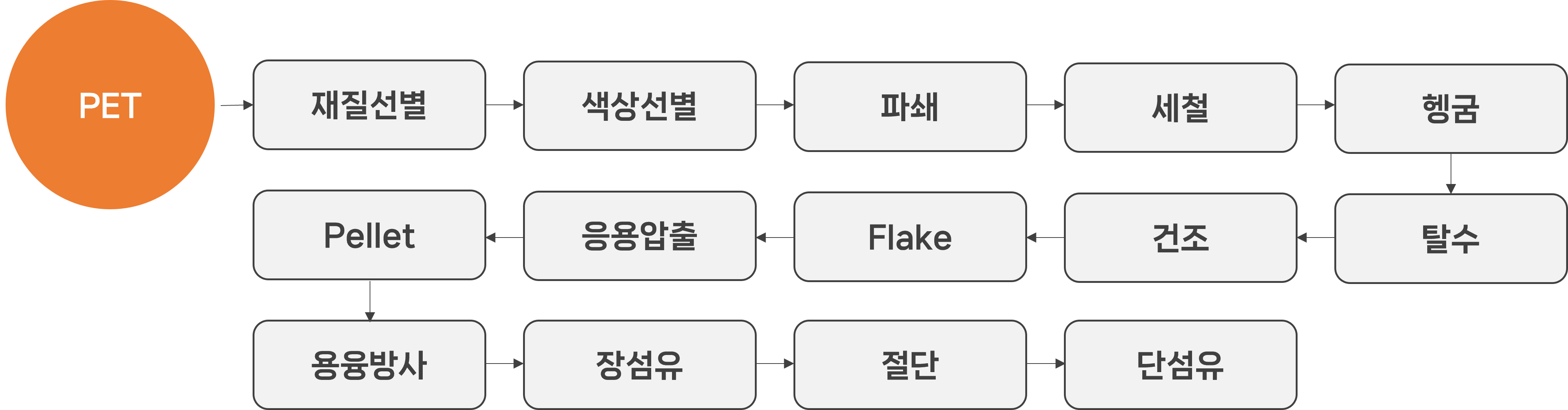 PET는 최근 플라스틱에서도 분리배출을 하고 있는 재료이기도 합니다. PET는 정말 많은 제품으로 활용이 가능합니다. 부직포나 옷, 건축물 단열재, 옷 등 다양한 제품군으로 재활용이 가능한 재료이죠. PET는 다른 원재료보다 조금 더 복잡한 과정을 거쳐 재활용됩니다.