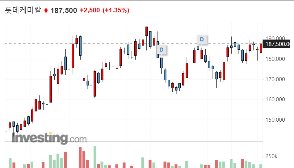 롯데케미칼은 장점과 단점이 뚜렷한 회사입니다. 주가의 위치는 저점을 계속 높여주면서 올라오는 모습을 보여줍니다. 고점을 넘기지는 못했지만 고점을 넘기려고 힘을 모아가는 모습이 있긴 합니다.