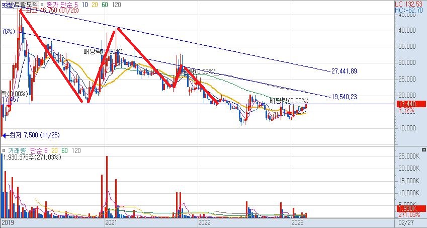 센트랄모텍의 주가위치는 수렴되다가 지지선을 깨고 내려가 겨우 저항선 주변에서 올라갈까 말까를 고민하고 있는 상태입니다. 아래 그림은 센트랄모텍의 주봉입니다. 큰 폭으로 상승 후 하락은 했지만 그동안 지지선에서 반등을 했던 모습을 보였었습니다. 그 모습이 깨진 것은 이차전지 시장 전망이 어두워진 2022년 1분기 이후 지지선을 깨고 내려갔으며, 지지선은 저항선이 되어 버렸습니다. 센트랄모텍의 중요 포인트는 바로 이 주가 위치가 이 위치를 다시 회복해 주고, 지지선이 되어 줄 것이냐에 있습니다.