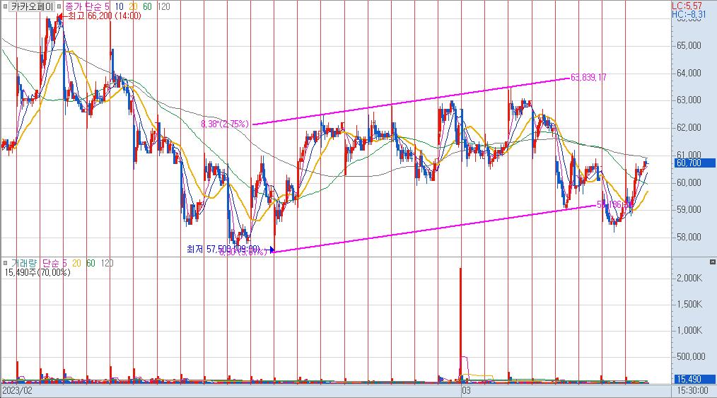 30분 봉으로 본 최근 카카오페이의 움직임을 보면 상하단 상승 추세 밴딩에서도 상단 근처에서 머물러 있었으며, 주가가 하락하더라도 금방 밴딩 안으로 복귀하는 모습을 보여주고 있습니다. 이것은 그만큼 카카오페이에 대한 매수 수요를 보여주는 증거이기도 합니다.