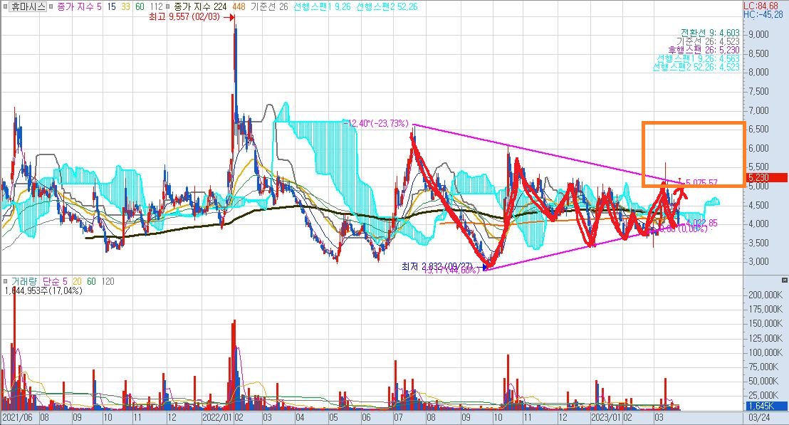 힘의 수렴은 이렇게 단기간 급등을 나오게 만듭니다. 주황색 박스 부분은 이제부터 휴마시스의 세력이 그려나갈 부분입니다.