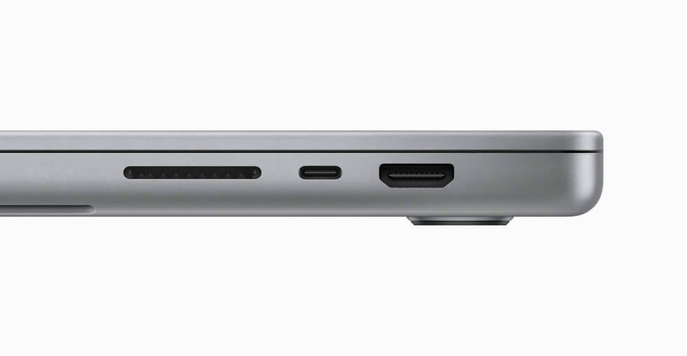다른 방향을 보니 썬더볼트 포트가 한 개 더 추가되어 있습니다. 이제 여유롭게 포트를 활용할 수 있겠네요. 그리고 SD카드 슬롯이 있고, HDMI포트가 추가되어 있습니다. 그래서 최대 8K 해상도 디스플레이 지원이 드디어 됩니다. 맥북에 추가 디스플레이를 연결해서 작업을 할 수 있습니다. 이전 모델에도 디스플레이 연결은 됐지만 8K 지원이 안 됐었죠. 꼭 고해상도가 아니더라도 240Hz에서 4K 해상도 디스플레이가 지원 가능하니 디스플레이 한 개로 작업하기 힘드신 분들은 연결해서 사용하셔도 되겠습니다.