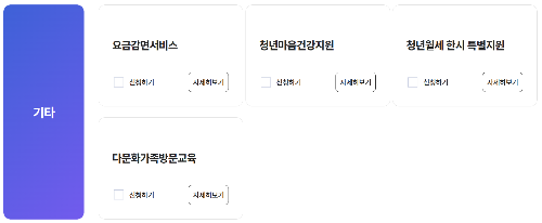 >>> 복지급여 신청에 메뉴에 들어가시면, 여러 조건에 해당하는 다양한 지원사업을 확인하실 수 있습니다. 그 중에서도 기타란의 '청년월세 한시 특별지원' 사업 신청하기를 체크하시면 됩니다.