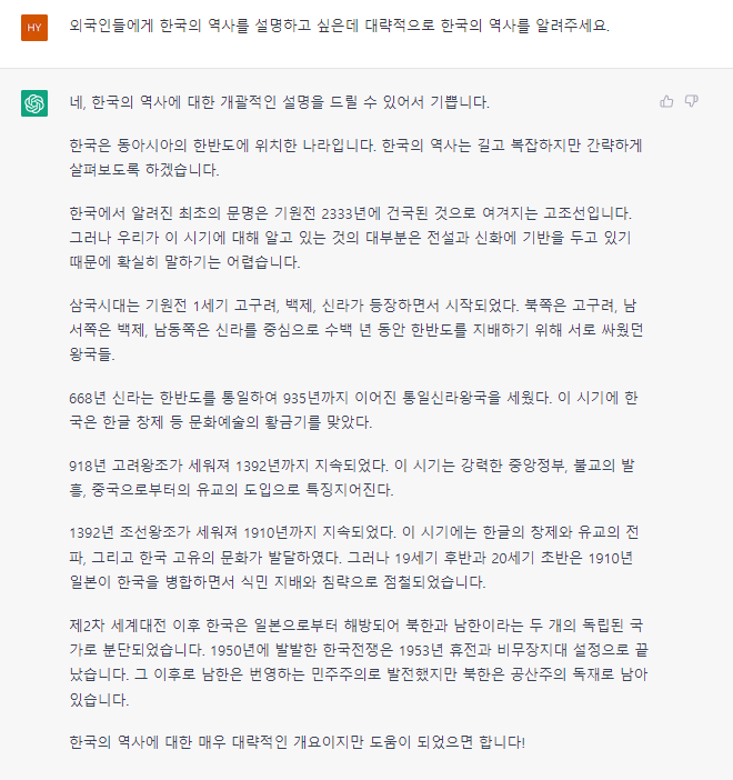 2) 번역기를 통해 먼저 질문을 작성해주겠습니다. 질문은 원하는 대답을 들을 수 있도록 자세하게 작성해 주는 것이 좋습니다. 내가 어디에 활용할 것인지, 어떤 목적으로 쓸 것인지 정도의 구체적인 질문일수록 더 정확한 답을 얻을 수 있습니다. 파파고에 "외국인에게 대한민국의 역사에 대해서 설명하고 싶은데, 대한민국의 역사에 대해서 대략적으로 알려줘"라는 문장을 번역해 보겠습니다.