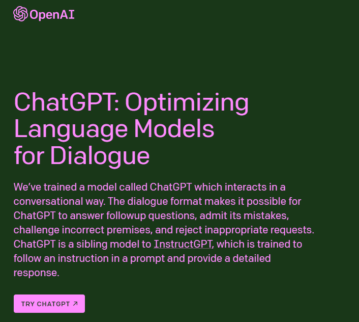 We’ve trained a model called ChatGPT which interacts in a conversational way. The dialogue format makes it possible for ChatGPT to answer followup questions, admit its mistakes, challenge incorrect premises, and reject inappropriate requests. ChatGPT is