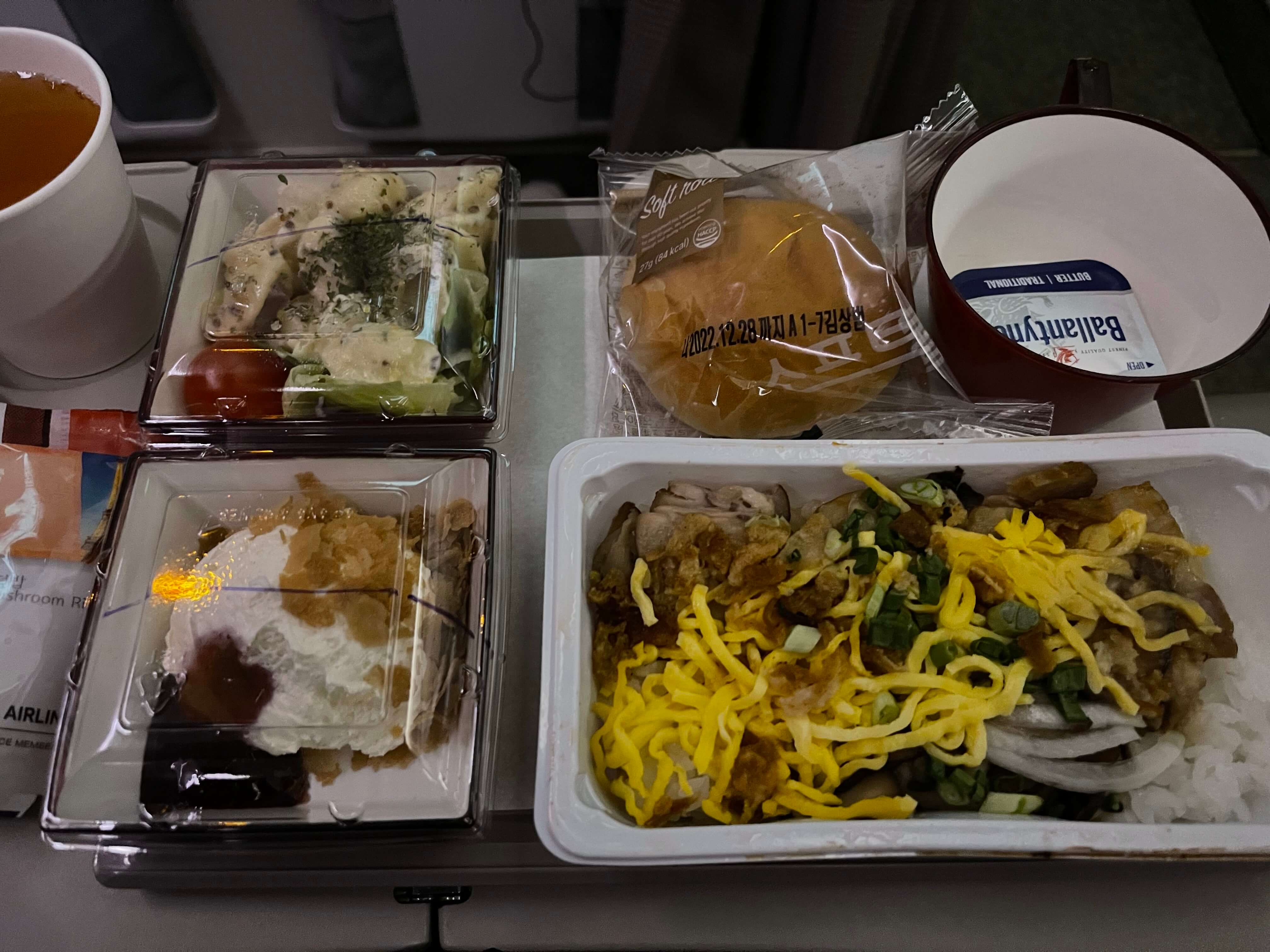 첫 번째 사료로는 불고기 쌈밥이 나왔습니다. 맛은 뭐 그럭저럭 한국사람이면 먹을 수 있을 정도입니다. 우거지국이 약간 물맛이 나긴 하지만 비행기라 그러려니 했습니다.