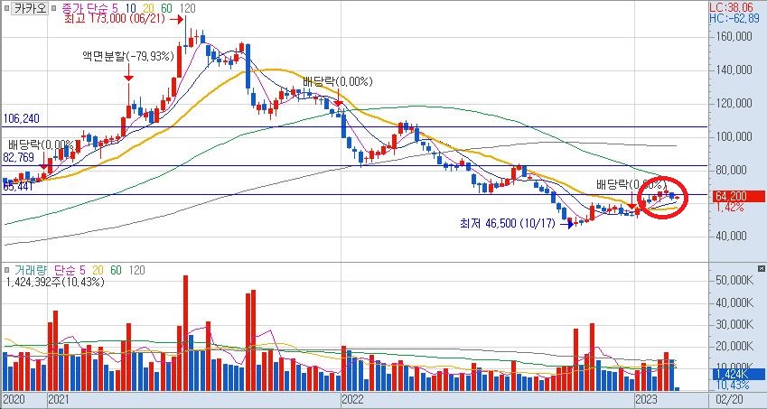 2021년 20주선을 뚫고 내려온 이후 거의 2년이 거의 다 되서 20주선 위로 올라온 모습을 보여 줍니다. 물론 네이버도 마찬가지입니다. 카카오나 네이버나 단기적인 저항대에 걸려 있는 것은 사실입니다. 65,000원을 넘어가면서 카카오를 보유하고 계시는 분들은 다시 시작하는 건가 라는 생각을 하실지도 모르겠지만, 아직은 시간이 필요해 보입니다.