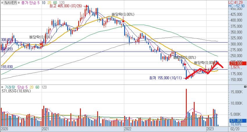 네이버만 하락한 것이 아닙니다. 어차피 코스피, 코스닥 대부분 종목이 이런 차트 모양을 가지고 있기 때문에 계속 하락한다는 소리는 들을 필요가 없습니다.