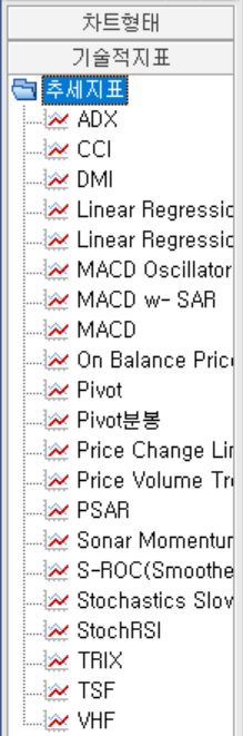 그럼 왼쪽의 기술적 지표라는 메뉴가 보이실겁니다. 여기에서 추세지표를 선택해줍니다.