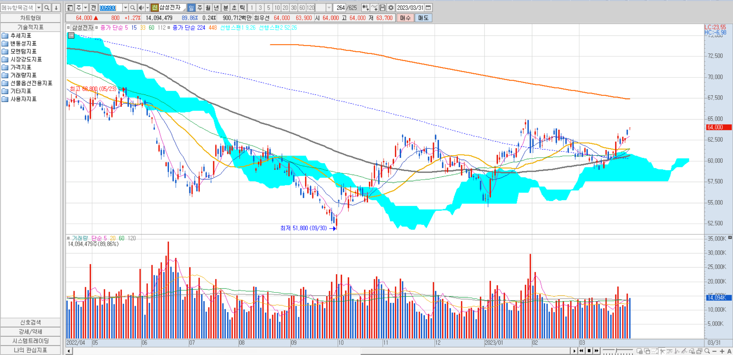 MACD는 저의 경험 상 대형주에서 종목에서 상향 추세를 만든다고 판단됐을 경우에 사용하는 편이 수익 확률이 높은 편이었습니다. 예를 들어 삼성전자의 경우, 아래 그림처럼 MACD라인과 시그널이 교차하는 경우 매수를 할 수 있습니다. MACD라인과 시그널이 교차한다고 무조건 매수하는 것이 아니라 장단기 차이가 역배열 상태여야 합니다. 역배열이기 때문에 오른쪽 Y축의 값이 마이너스가 됩니다.