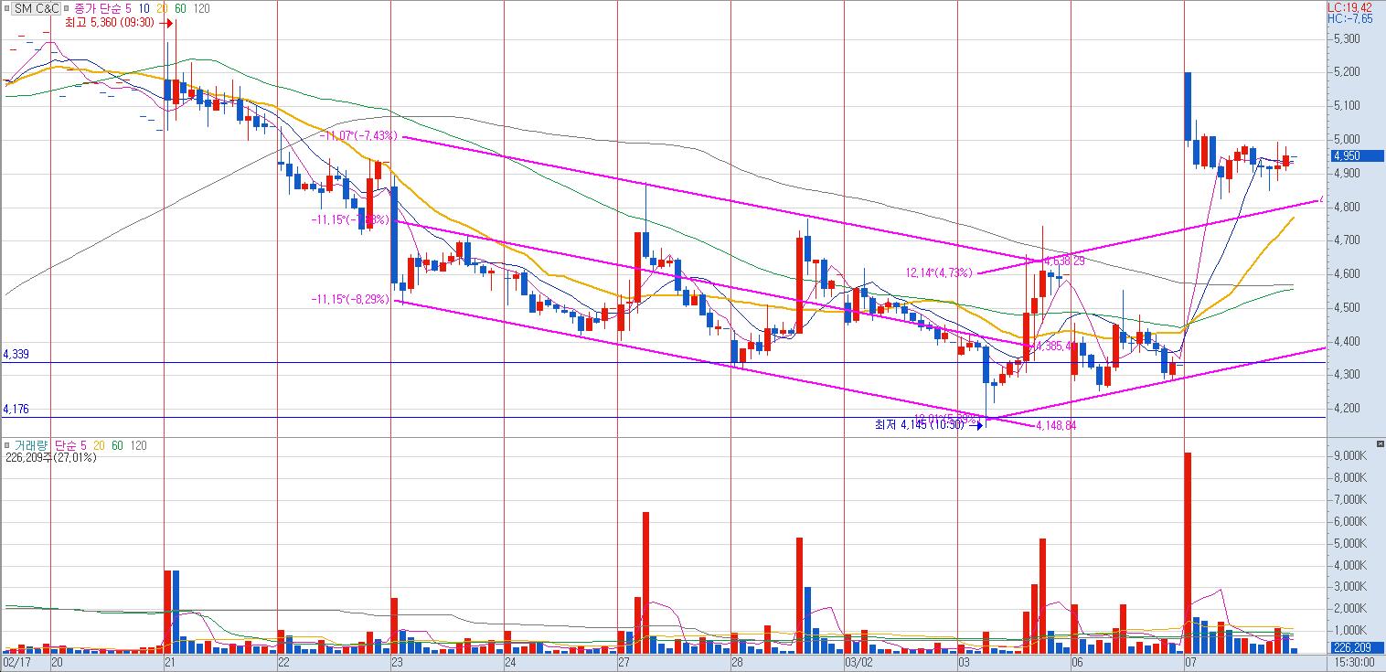 SM 관련주는 올라온 폭만큼 조정기간이 필요한 종목들입니다. 보유하신 분들은 보수적으로 접근하셔서 수익부터 챙기시는 것이 좋습니다. 또한 신규로 보시는 분들은 조심하셔야 합니다. 개인투자자가 기관과 외국인에 비해서 유리한 점은 굳이 좋지 않은 종목을 사지 않을 수 있고 현금을 가지고 있을 수 있다는 점입니다. 여러 가지 의견을 참고하시는 것은 좋은 습관이지만, 먼저 자본시장에서는 자본을 지키시는 것이 좋습니다.