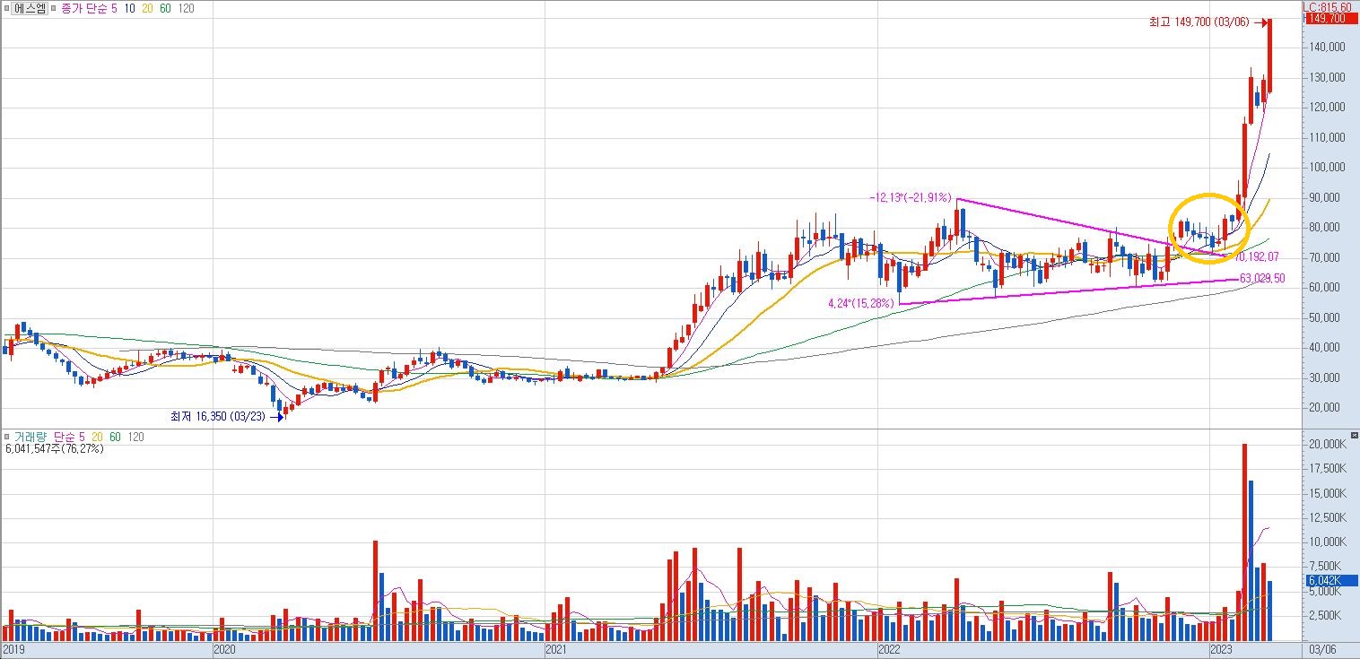 에스엠의 매수 포인트는 바로 노란색 동그라미로 표시된 부분이었습니다. 저기서 잡았어야 했는데 이제서야 보입니다. 사실 이렇게 다 지나고 난 후에 차트분석하는 것이 의미 없게 느껴지실 수 있지만, 다른 종목을 놓치지 않기 위해서라도 여러 가지 종목의 차트를 분석하는 것은 필요합니다. 물론 차트만 분석하시면 안 되고요.