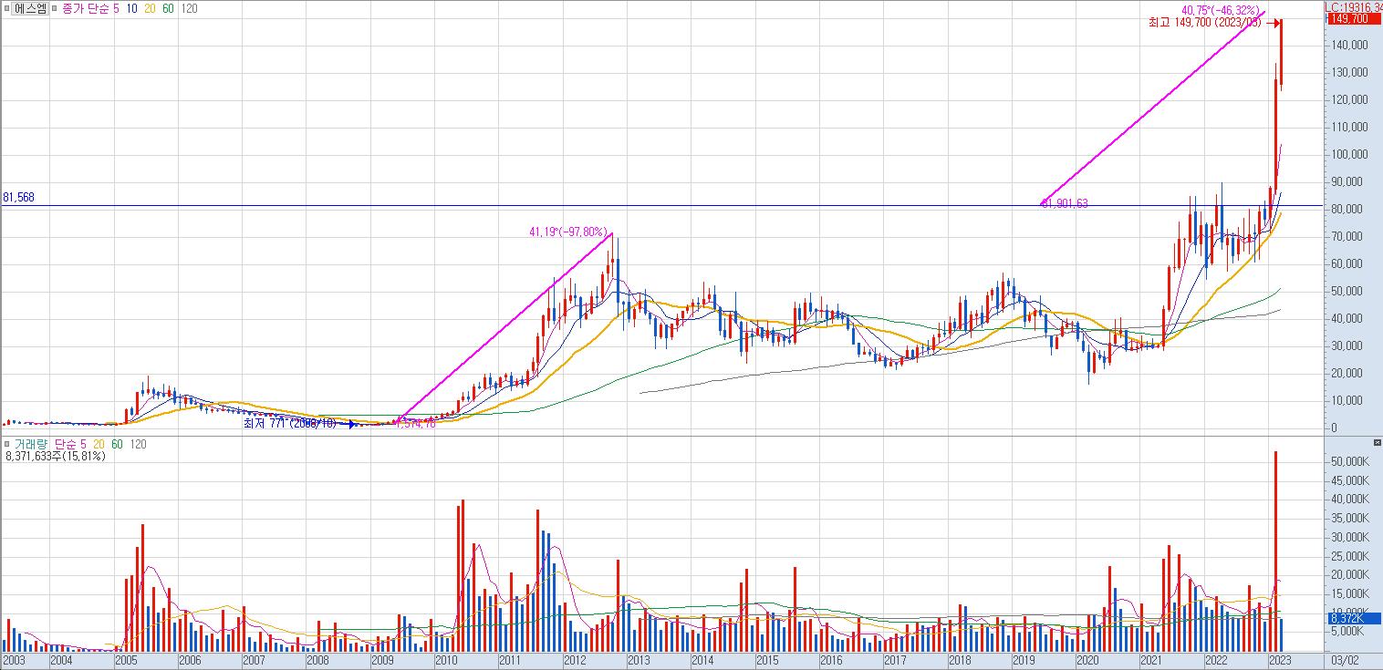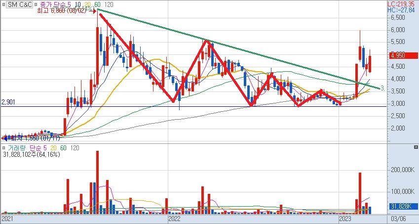 하이브의 전략에 따라 달라지긴 하겠지만 현재 에스엠의 주가는 올라갈 만큼 올라갔다고 보입니다. 변수는 하이브입니다. 만약 에스엠을 보유하고 계시다면 이제는 수익실현을 하셔야 할 때입니다. 이슈로 오른 급등은 그 뒤에 급락이 오는 패턴을 정말 많이 보여줍니다.