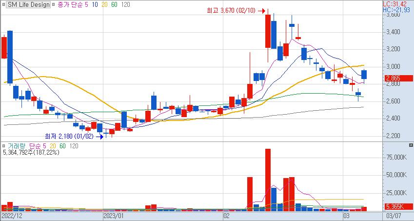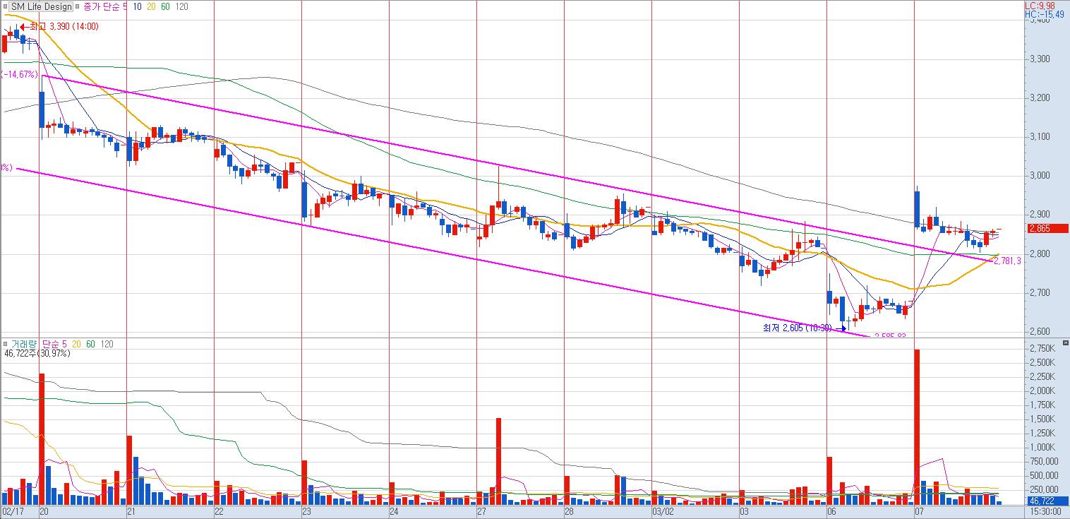 일봉을 보면 갭을 띄우긴 했지만 20일선을 뚫어주지도 못했고, 겨우 5일선을 지켜주는 정도로 끝났습니다. SM C&C보다 더 힘이 약한 SM Life Design입니다. 차트만 보고 판단하자면 세력은 이미 2월 10일에 물량을 털고 일부 물량만 가지고 있을 확률이 높아 보입니다. 주가를 끌어올리면서 상단 부근에서 매도했고 이것을 개인이나 기관이 받았을 가능성이 있습니다.